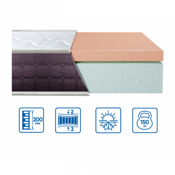 Висота 20 см, чохол не зйомний, витримує максимальне навантаження на одне спальне місце 150 кг.